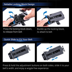 Das V51 Holster bietet höchste Einstellbarkeit gepaart mit Robustheit und Sicherheit. Der Gürtelclip lässt sich leicht an Gürtel oder Einsatzwesten anpassen und ist sogar MOLLE-kompatibel. Die Taschenlampenhalterung ist um 360° drehbar und ermöglicht so eine optimale Anpassung an Ihre Bedürfnisse.