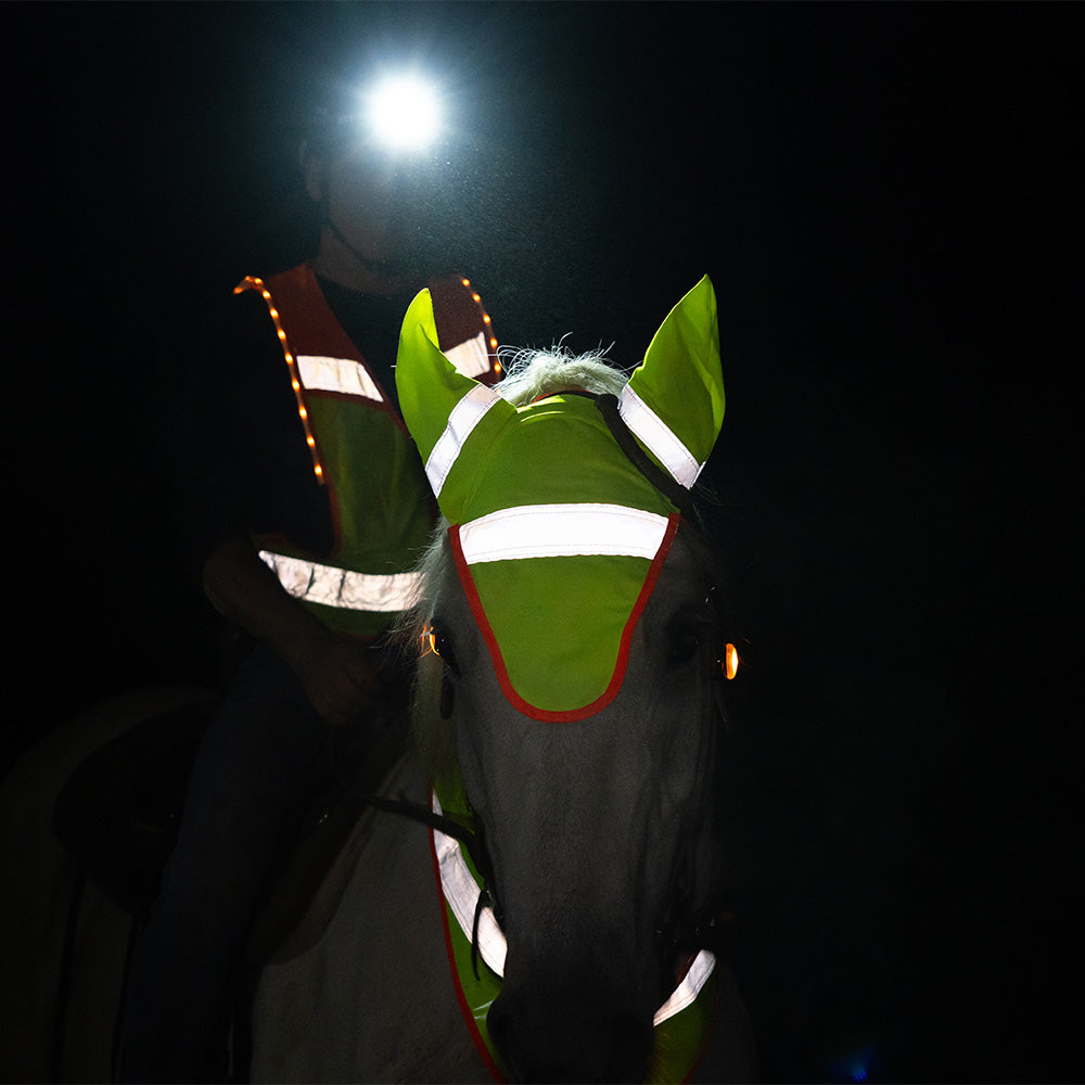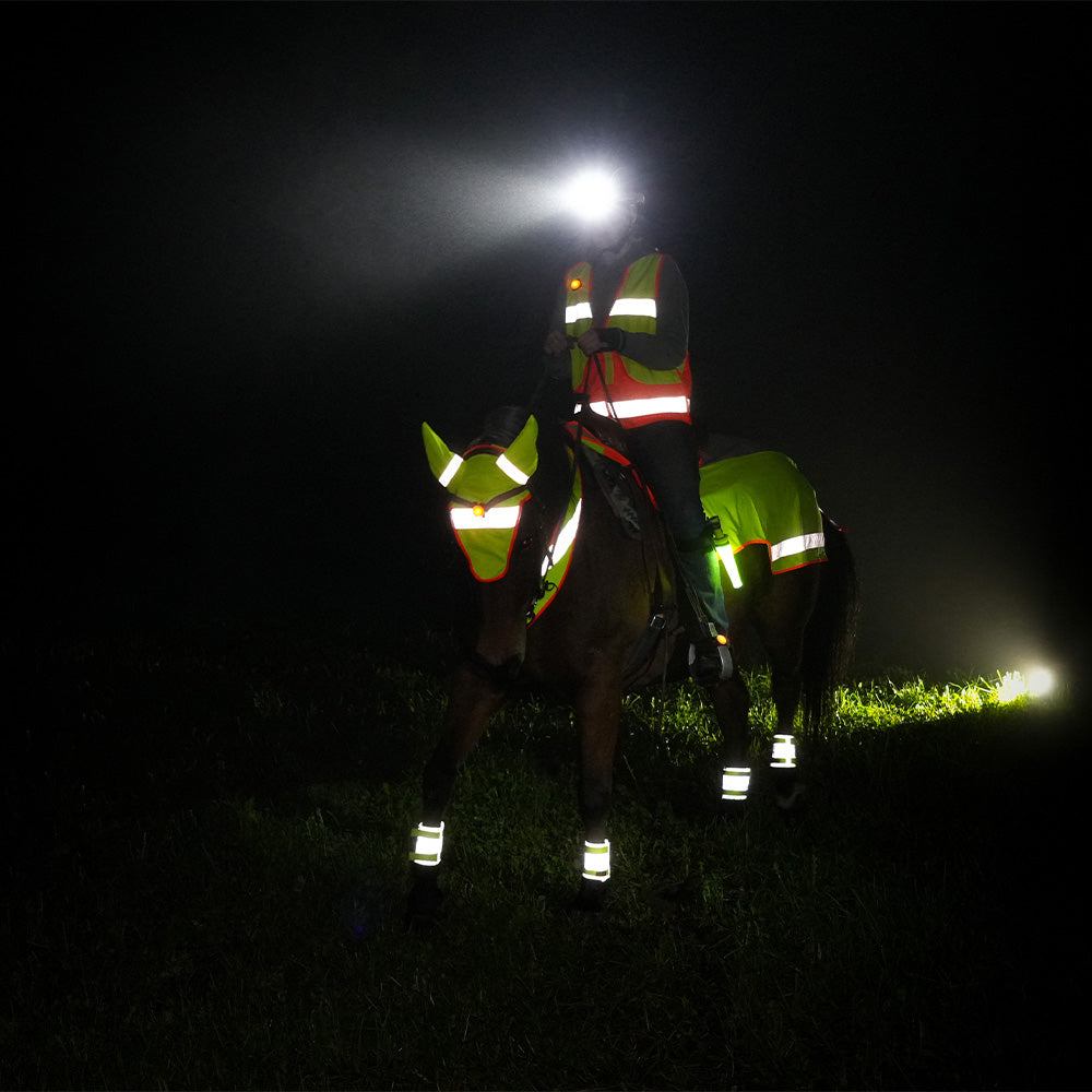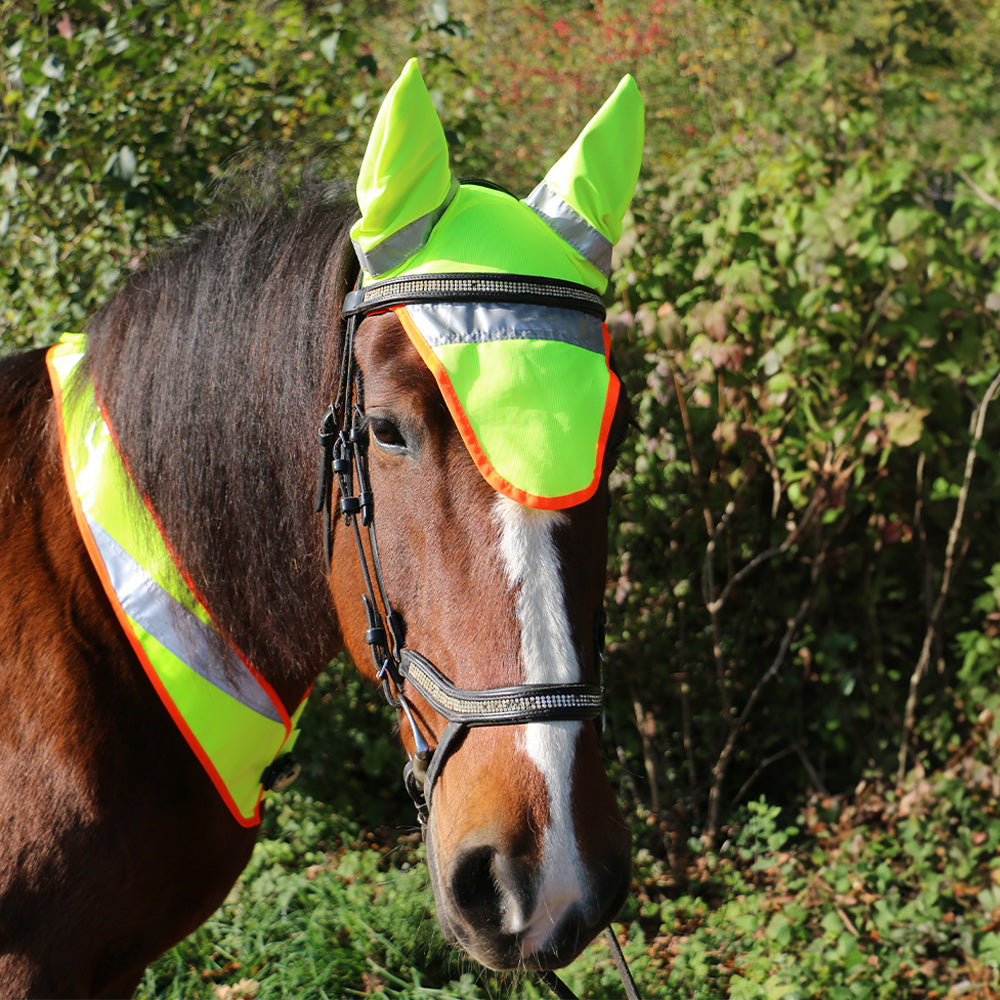 Our luminous ear yarn has a high-quality, 50 mm wide reflective strip on the forehead and two slightly thinner strips around the ears. The ear yarn is made of a light, bright yellow fabric that improves visibility at dusk.