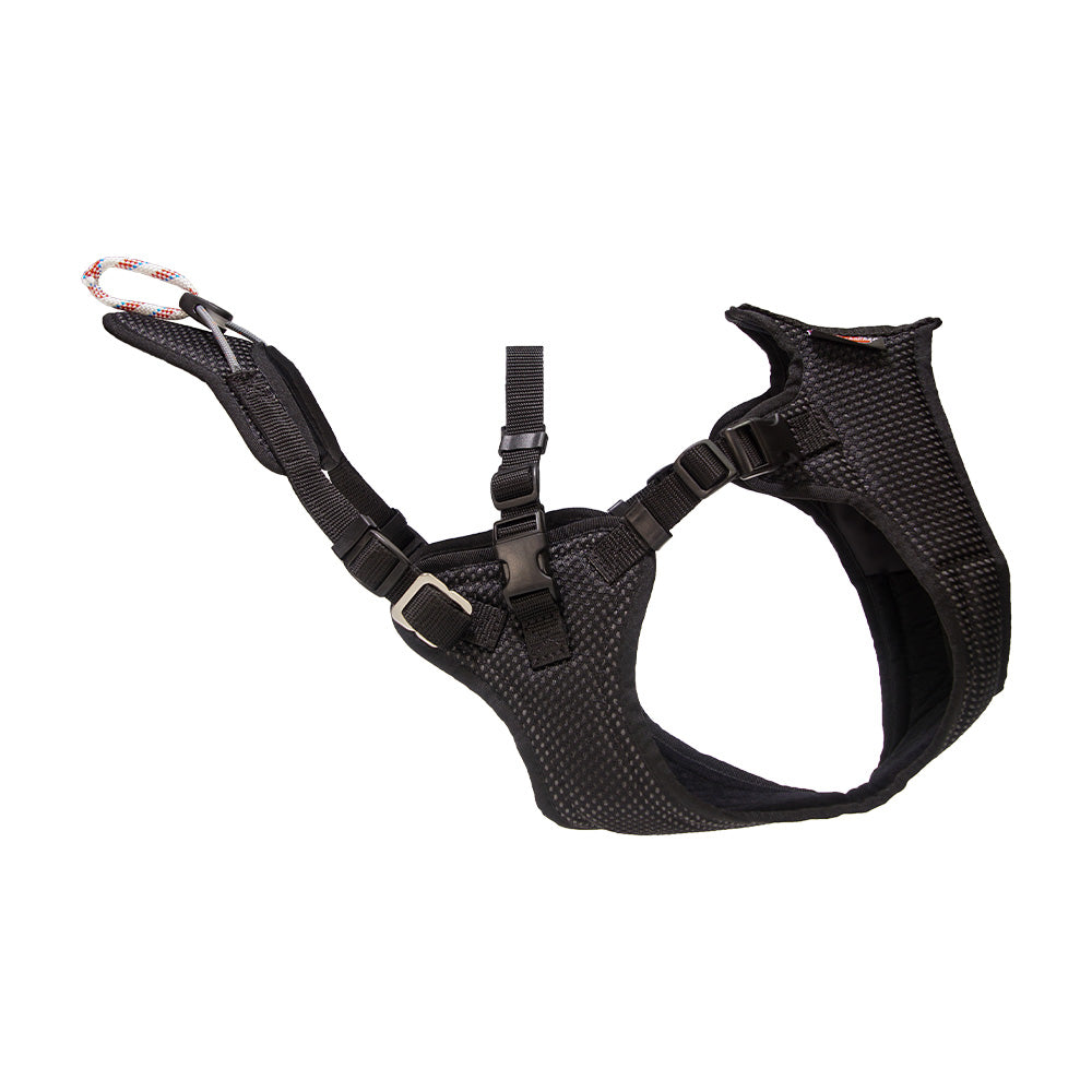 The harness shape runs steeply upwards at the neck, so that the dog can hold its head high when running without feeling pressure on the cervical vertebrae (the opposite is the case with belt harnesses - these constantly put pressure on the dog's neck and make it impossible to run with its head held high!).