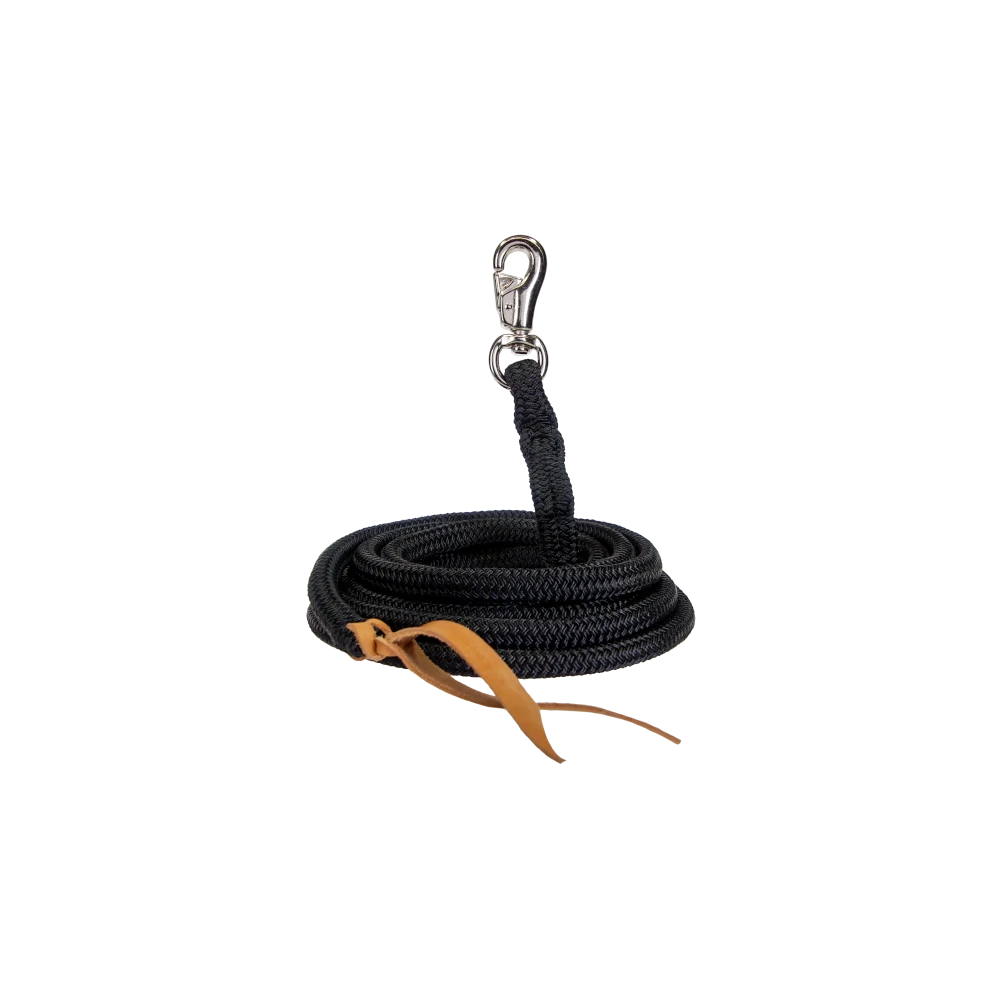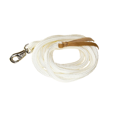 Notre corde de horsemanship est équipée en standard d'un bullsnap et d'un taquet en cuir. Sur demande, il est possible d'ajouter une boucle, un mousqueton et un anneau. La corde est disponible en noir et en blanc et a une longueur standard de 3.80m ou 7.50m et une largeur de 14mm ou 16mm.