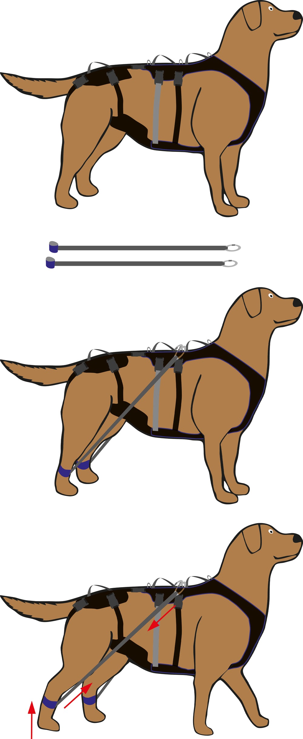 Wenn der Hund läuft und das Bein entlastet, wird es durch den Expander angehoben und nach vorne gezogen. So schleifen weder die Füsse noch die Krallen auf dem Boden.